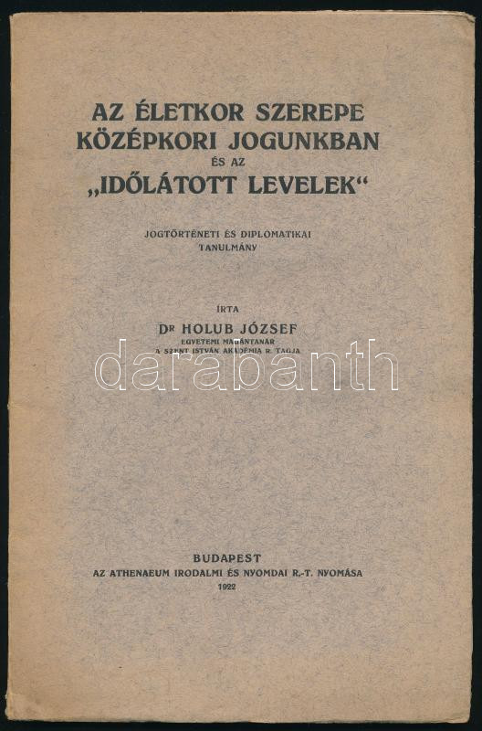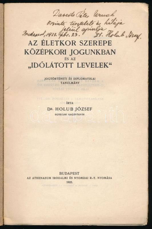 Holub József: Az életkor szerepe középkori jogunkban és az "időlátott levelek." Jogtörténeti és diplomatikai tanulmány. A szerző, Holub József (1885-1962) történész, jogtörténész, egyetemi tanár által DEDIKÁLT példány.