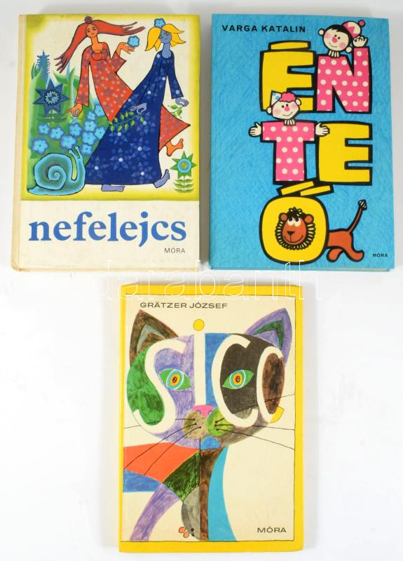 3 db mesekönyv: Nefelejcs. Szép magyar versek kisiskolásoknak.; Grätzer József: Sicc. Szórakoztató időtöltések, cseles csalafintaságok.; Varga Katalin: Én, te, ő. Kalandok a szófajok birodalmában. Bp., 1982-1987, Móra. Kiadói félvászon-kötés / kartonált papírkötés, változó állapotban.
