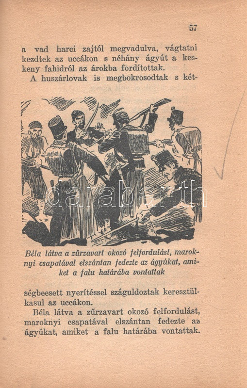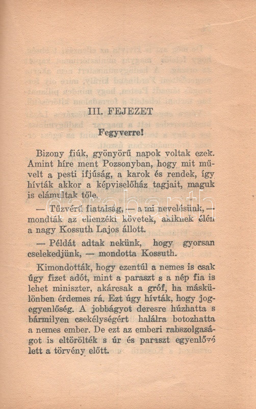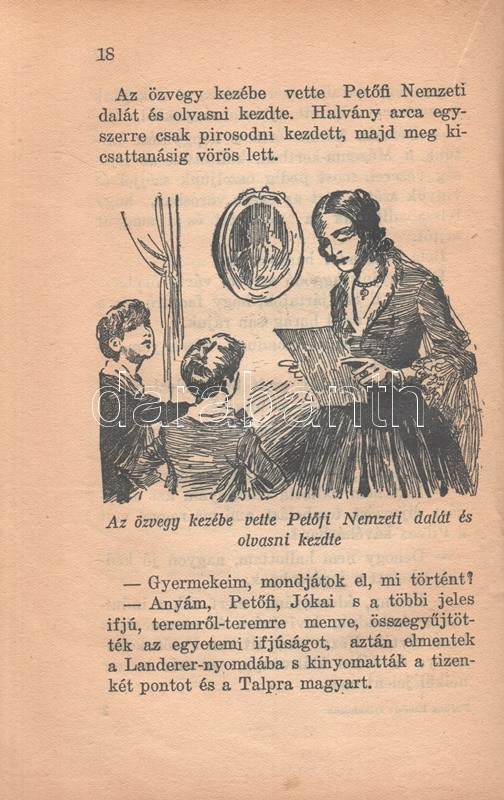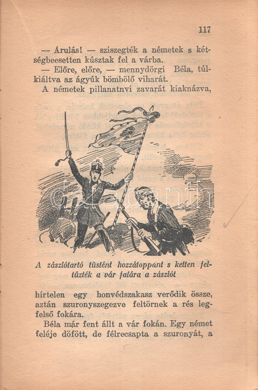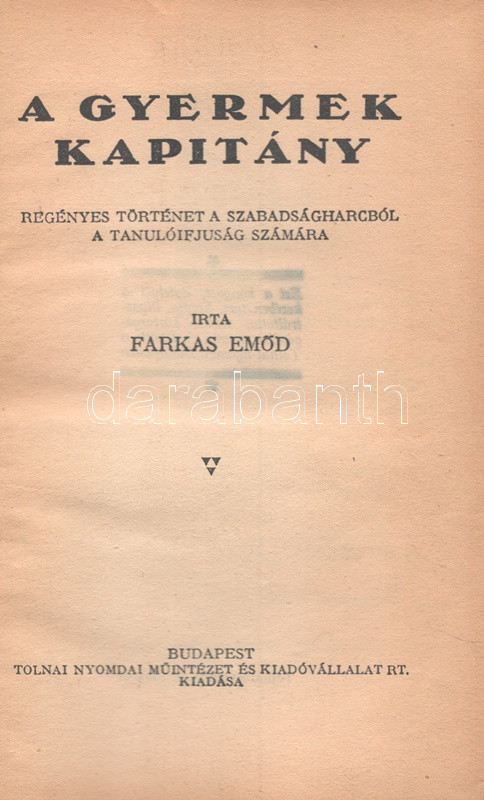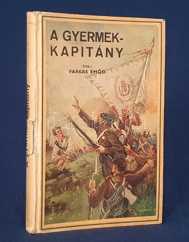 Farkas Emőd: A gyermek kapitány. Regényes történet a szabadságharcból a tanulóifjúság számára. Budapest, [1935 körül]. Tolnai Nyomdai Műintézet és Kiadóvállalat Rt. 122 + [6] p. Farkas Emőd (1866-1920) író, újságíró, műfordító ifjúsági regényét oldalszámozáson belül Sebők Zsigmond szövegközti illusztrációi díszítik. Az első előzéken régi katalóguscímke. K. Sávely Dezső grafikusművész színes rajzával illusztrált, enyhén sérült gerincű kiadói kartonkötésben. Jó példány.