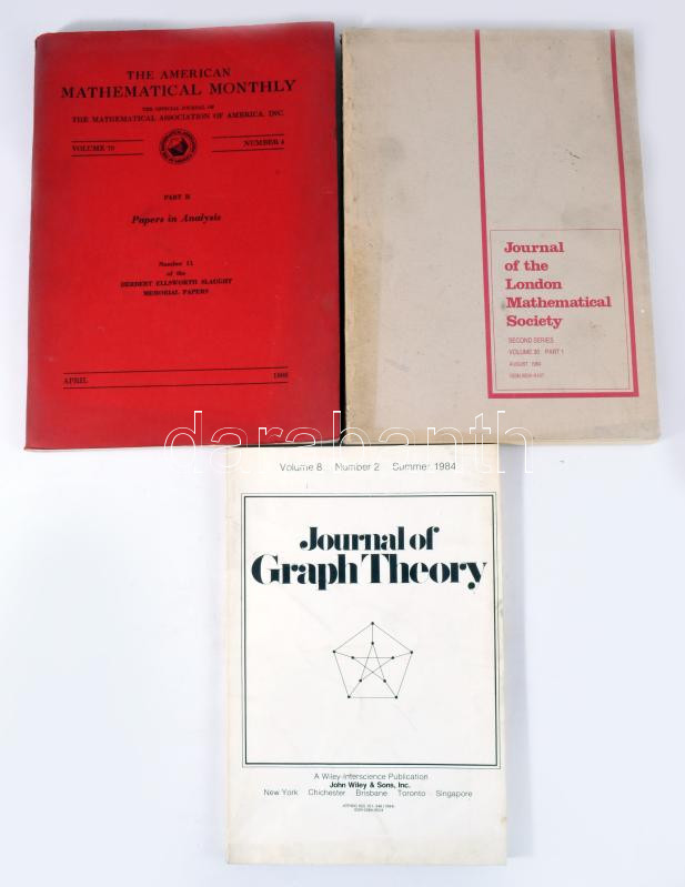 3 db angol nyelvű matematikai kiadvány: The American Mathematical Monthly Vol. 73. No. 4. April 1966. + Journal of the London Mathematical Society. Second Series. Vol. 30. Part 1. August 1984. + Journal of Graph Theory Vol. 8. No. 2. Summer 1984. Kiadói papírkötés, vegyes állapotban.