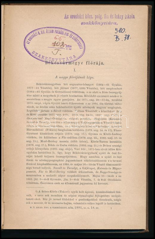 Dr. Borbás Vince: Békésvármegye flórája. Bp., 1881, MTA. Egészvászon kötés, kopottas állapotban.