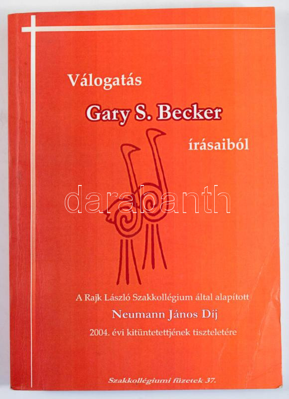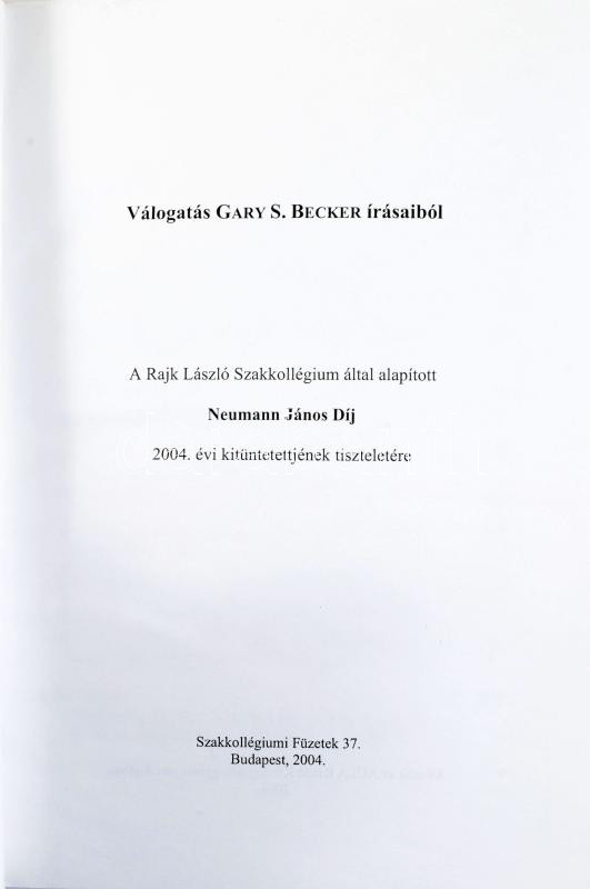 Gary S. Becker: Válogatás Gary S. Becker írásaiból. A Rajk László Szakkollégium által alapított Neumann János Díj 2004. évi kitüntettjének tiszteletére. Bp., 2004, Szakkollégiumi Füzetek 37. Gary S. Becker (1930-2014) amerikai Nobel-díjas közgazdász. Kiadói papírkötés, a borítón gyűrődésekkel.