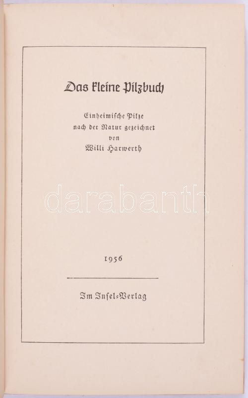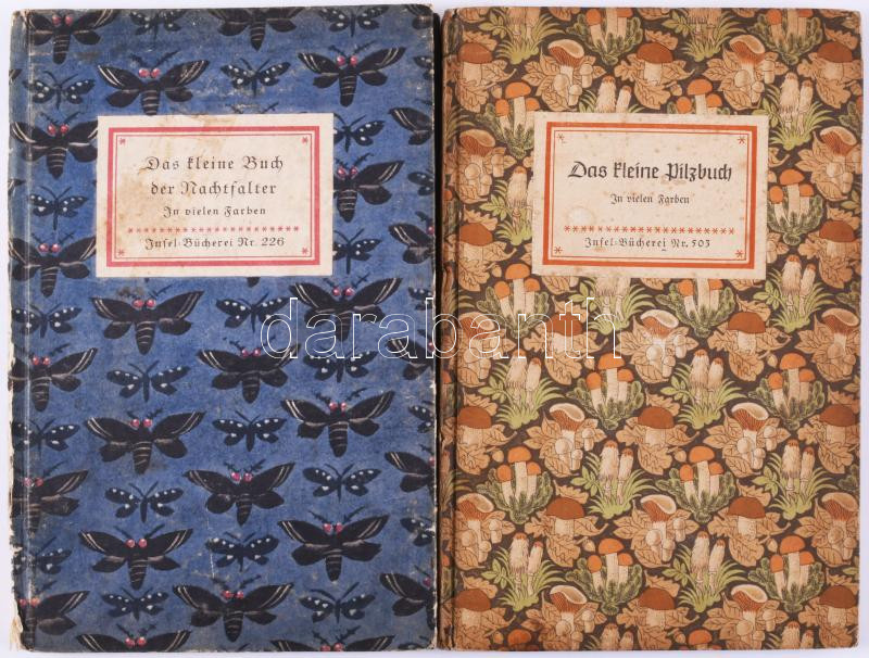 Insel-Bücherei 2 kötete: Willi Harwerth: Das kleine Pilzbuch. + Jakob Hübner: Das kleine Buch der Nachtfalter. Leipzig, 1956/é.n., Insel-Verlag. Egészoldalas, színes illusztrációkkal. Német nyelven. Kiadói kartonált papírkötés, az egyik kötet sérült gerinccel.