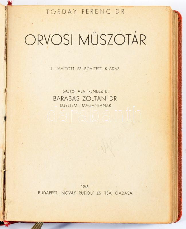 Torday Ferenc: Orvosi műszótár. Sajtó alá rendezte Barabás Zoltán. Budapest, 1948. Novák Rudolf és Társa (Hungária Hírlapnyomda Rt.) 537 + [1] p. Torday Ferenc (1871-1942) gyermekorvos latin-magyar orvosi műszótára tíz év kutatómunkájának eredménye. A mű első kiadása 1941-ben jelent meg, példányunk a munka második, bővített kiadásából való. kiadói félvászon kötésben.