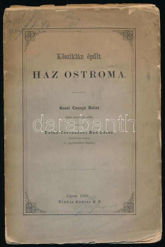 Kősziklán épült ház ostroma. Kocsi Csergő Bálint latin munkája után fordította Felső-Csernátoni Bod Péter. Lipcse, 1866, Köhler. Kiadói papírkötés, viseltes állapotban.