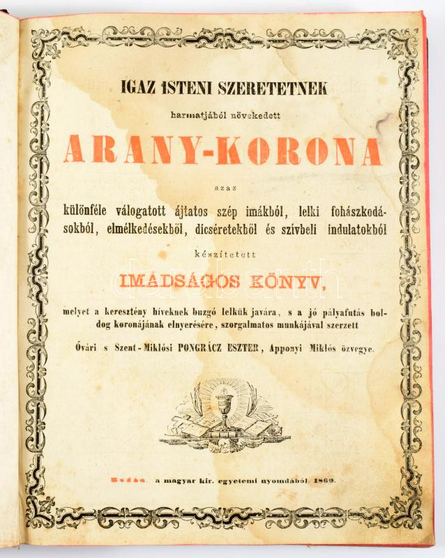 Pongrácz Eszter: Igaz isteni szeretetnek harmatjából növekedett arany-korona, azaz különféle válogatott ájtatos szép imákból, lelki fohászkodásokból, elmélkedésekből, dicséretekből és szívbeli indulatokból készítetett imádságos könyv, melyet a keresztény híveknek buzgó lelkük javára, s a jó pályafutás boldog koronájának elnyerésére, szorgalmatos munkájával szerzett Óvári s Szent-Miklósi - - , Apponyi Miklós özvegye. Budán, 1869, Magyar Kir. Egyetemi Nyomda, [8]+363+[5] p. Aranyozott egészvászon-kötésben, foltos lapokkal, ázásnyomokkal.