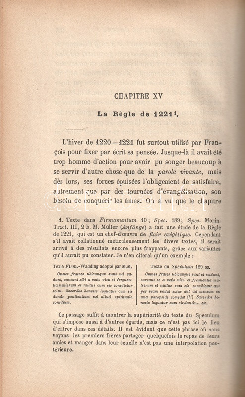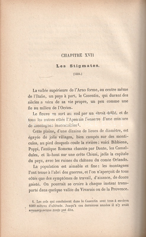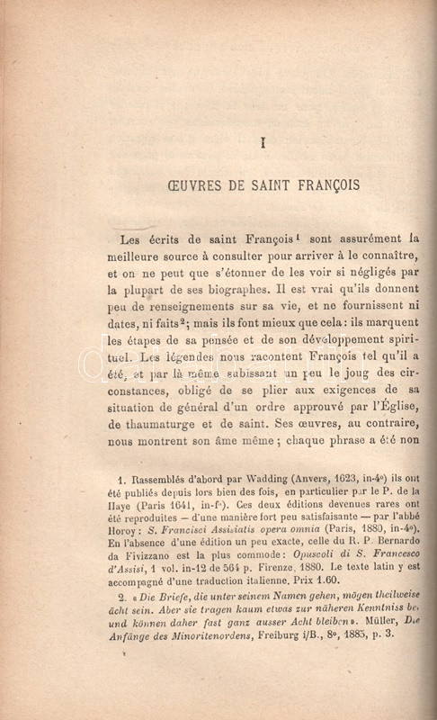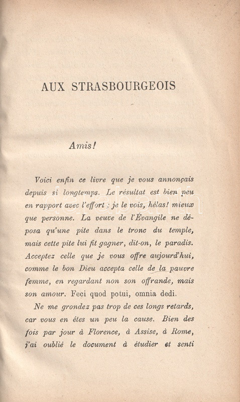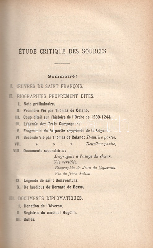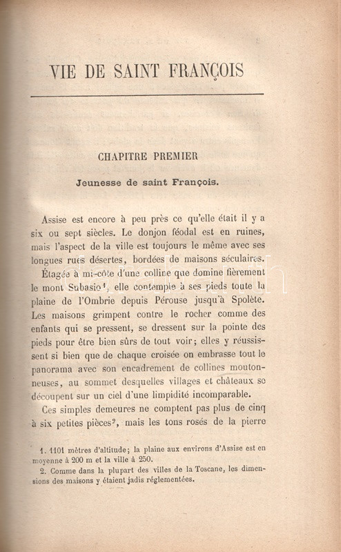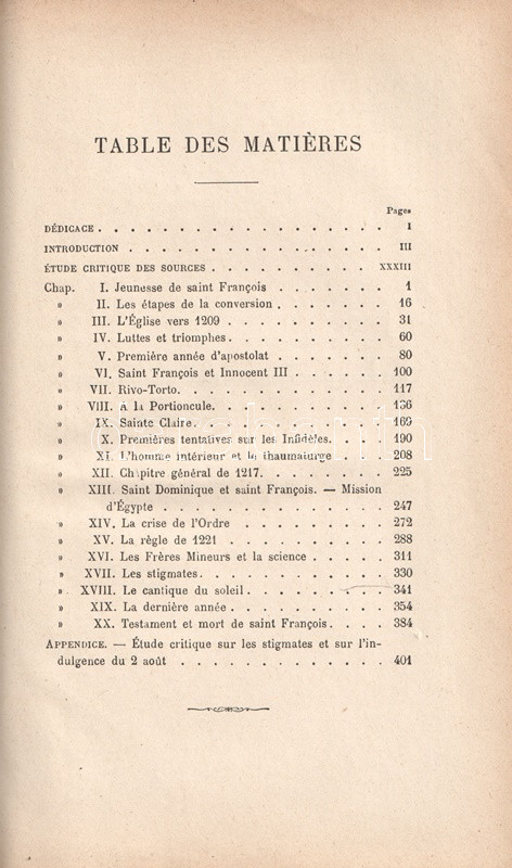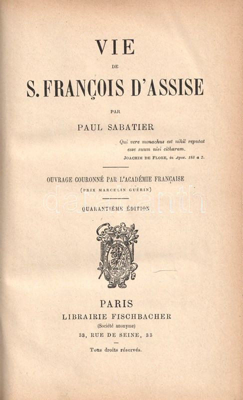 Paul Sabatier (1858-1928) francia protestáns lelkész, történész, középkorász, az első modern Szent Ferenc-életrajz írója. Kritikai szemlélettel megírt könyve 1893-ban jelent meg, egy éven belül elnyerte a Francia Akadémia díját, valamint rákerült a Vatikán által betiltott könyvek jegyzékére. Példányunk a munka 40. [!] kiadásából származik.