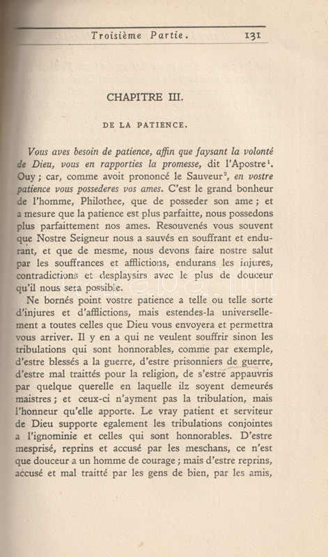 Szalézi Szent Ferenc (1567-1622) francia katolikus teológiai doktor, hitszónok, hitvitázó, rendalapító, főként a Savoyai Hercegség és Svájc területén működött. Korszakában a svájci-savoyai területen a protestáns egyházak erős befolyással bírtak, így szerzőnk gyakran üres templomokban kényszerült hirdetett igét. Tapasztalatából kiindulva beszédeit inkább írásos formában terjesztette. Ügybuzgalma nem volt hiábavaló: működési területén a helységek egymás után tértek katolikus hitre. A Genf címzetes püspökévé választott szerző 1608-ban írta meg fő művét "Introduction á la Vie dévote" (Bevezetés a jámbor életbe) címmel, mely a következő évben nyomtatásban is megjelent (Lyon, 1609). Az öt részre tagolódó munka az imádságos, jámbor katolikus élet elveit dolgozza ki. 1930. évi kiadásunkból a rendes kiadáson felül 516 számozott példány is készült, különleges papírra. Példányunk számozatlan.