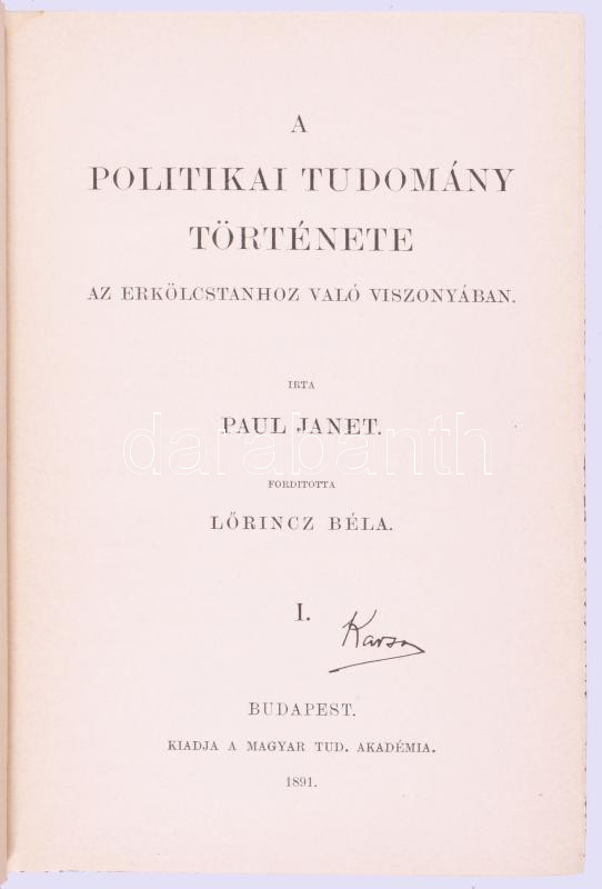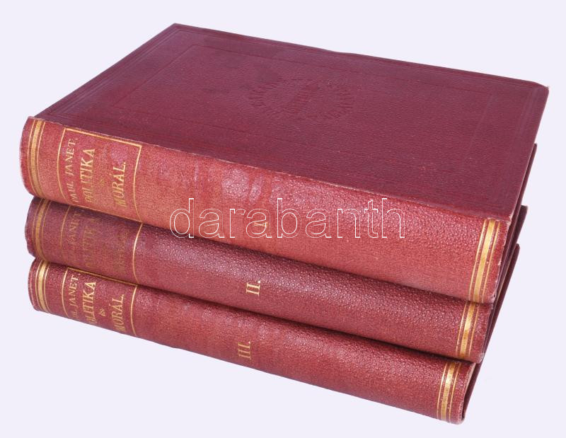 Janet, Paul: A politikai tudomány története az erkölcstanhoz való viszonyában. I-III. köt. Ford.: Lőrincz Béla, Angyal Dávid. Bp., 1891-1892, MTA, VI+[2]+608 p.; [4]+543+[1] p.; [4]+567+[1] p. Első magyar kiadás. Kiadói egészvászon-kötés, a II. kötet erősebben ázott borítóval, helyenként foltos lapokkal.