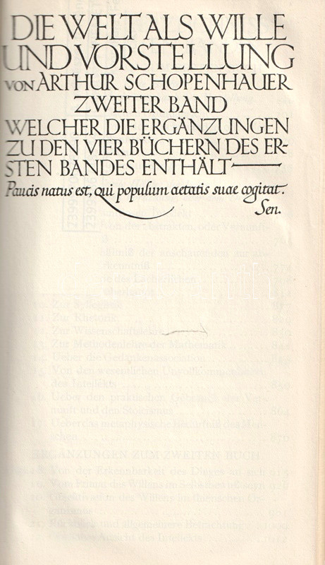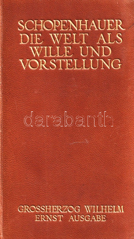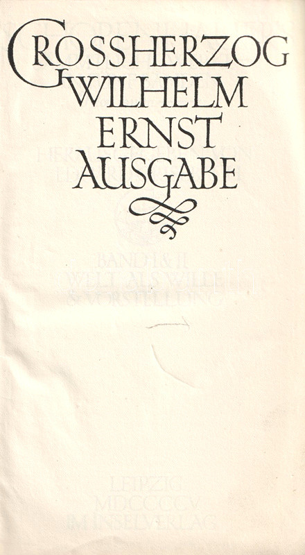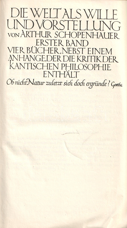 Kötetünk a német filozófiai írók munkáit bibliofil kiállításban közreadó ?Grossherzog Wilhelm Ernst Ausgabe?-sorozatban jelent meg. Tételünk Arthur Schopenhauer (1788-1860) 1819-ben kiadott művének, az életmű fő művének bibliofil kiadása. A nyugati filozófiai hagyományt a buddhista filozófiával először ötvöző, rendszerezett filozófiai munka a Kant utáni ismeretelmélet, ontológia, esztétika és etika területein radikális újdonságokkal szolgált; befolyása főként a szerző halála után, a XIX. század második felétől növekedett meg. Bibliofil kötetünk kalligrafikus belső címlapjait Eric Gill grafikusművész rajzolta.