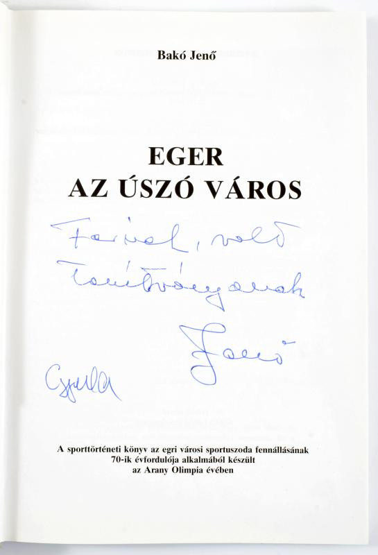 Bakó Jenő: Eger, az úszó város. Benne Bakó Jenő, eredetileg Heizer Jenő (1921?2000) magyar úszó, mesteredző, sportvezető, szakíró és Válent Gyula (1926-2010) úszó, vízilabdázó, edző DEDIKÁCIÓJÁVAL! Eger, Egri Nyomda. Kiadói kartonált kötés, jó állapotban.