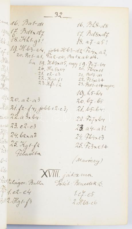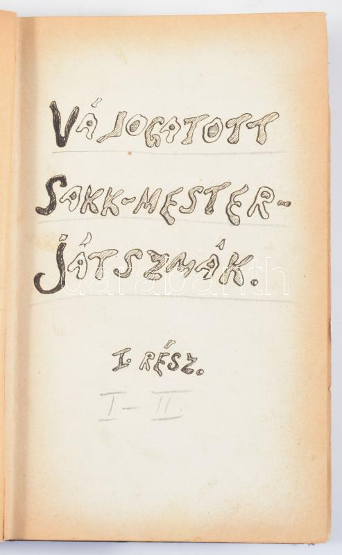 cca 1900-1910 Válogatott sakk-mester játszmák I-II. rész. Kézzel írt sakk játszma-gyűjtemény. A könyv második részre nagyrészt üres, kézzel számozott oldalakkal, 228+2+12 p. Azonosítatlan személy munkája, vagy másolata. Átkötött félvászon-kötés, kissé kopott borítóval.