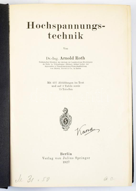 Arnold Roth: Hochspannungstechnik. Berlin, 1927, Julius Springer, VIII+534+2 p.+ 3 t. Fekete-fehér egészoldalas és szövegközti képanyaggal illusztrált.