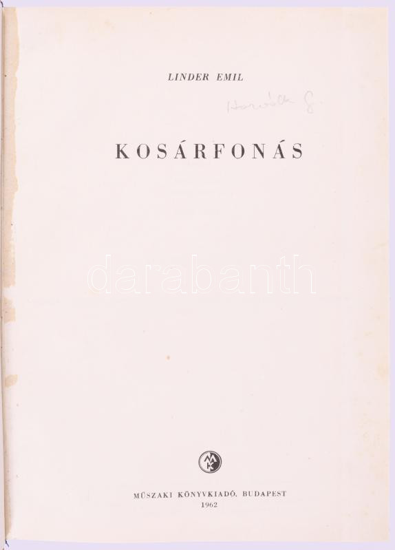 Linder Emil: Kosárfonás. Bp., 1962, Műszaki Könyvkiadó, 236 p. Fekete-fehér képekkel illusztrálva. Átkötött nyl-kötésben, a könyv végén néhány lapot rossz sorrendben kötöttek be. Megjelent 600 példányban.