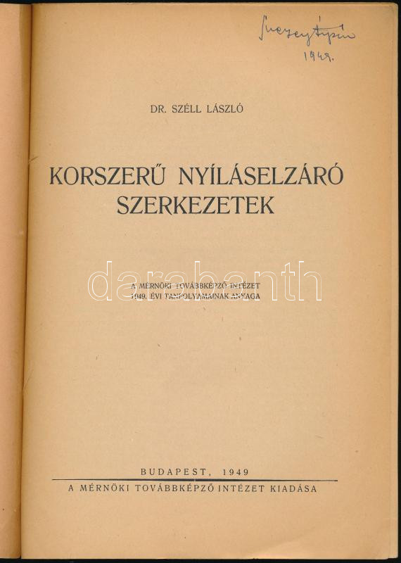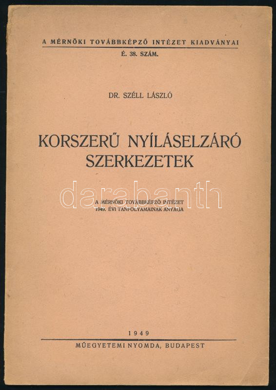 Széll László: Korszerű nyíláselzáró szerkezetek. A Mérnöki Továbbképző Intézet 1949. évi tanfolyamainak anyaga. Bp., 1949, Mérnöki Továbbképző Intézet, 56 p. Kiadói papírkötés, kissé sérült gerinccel.