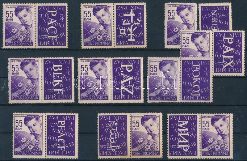 Románia 1956 Nemzetközi gyermeknap 10 x Mi 1578 Zf 10 klf szelvénnyel, közte magyar "BÉKE" felirattal (egyik szelvény elvált) (Mi EUR 350.-)