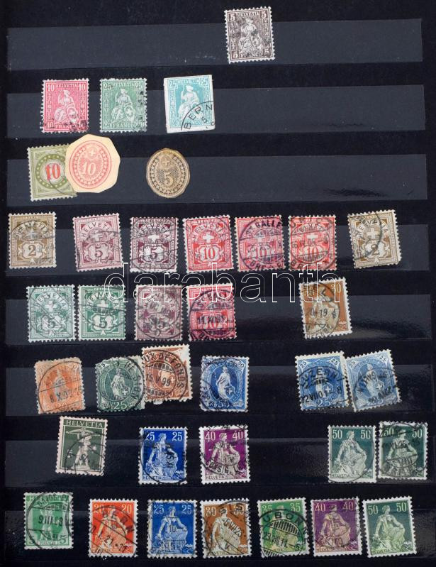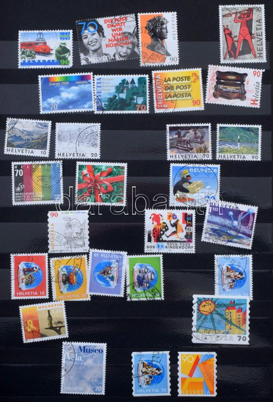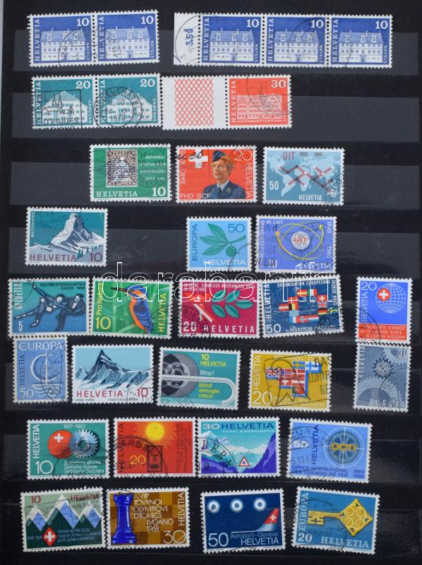 Svájci tétel, benne kb 640 db bélyeg 12 fekete lapos A4-es berakóban, tokkal
