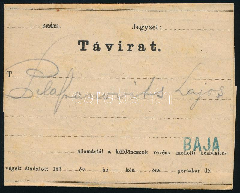 1874 Kézbesített távirat Pest - "BAJA" kék
