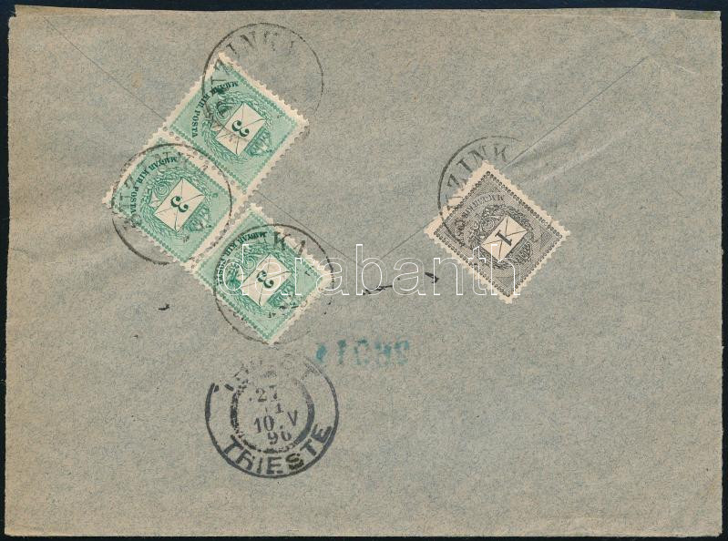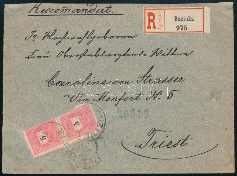 1890 Ajánlott levél előoldalon elektro 5kr pár, hátoldalon 1kr, 3 x színesszámú 3kr II. lemez E "BUZINKA" - "TRIEST"