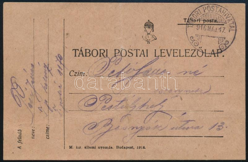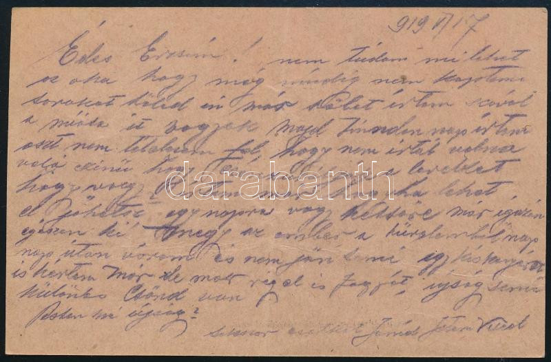 1919 Tábori posta képeslap a tanácsköztársaság idejéből szám nélküli, téves évszámú tábori posta bélyegzéssel, a feladóban 1170 tábori posta számmal, a szöveg szerint a dátum 1919 május 17