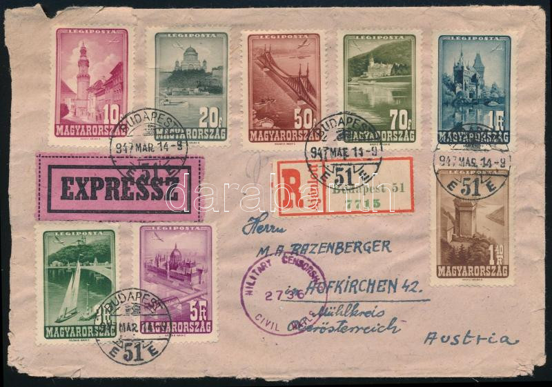 1947 Légiposta teljes sor expressz ajánlott levélen Ausztriába, ott cenzúrázva