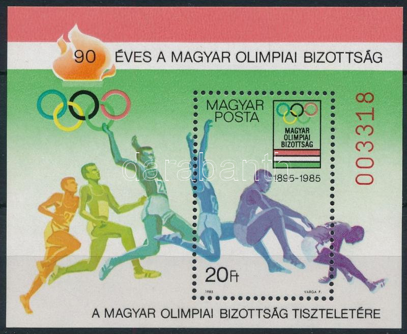 1985 90 éves a Magyar Olimpiai Bizottság ajándék blokk, hátoldalán "A Magyar Posta ajándéka" felirattal (26.000)