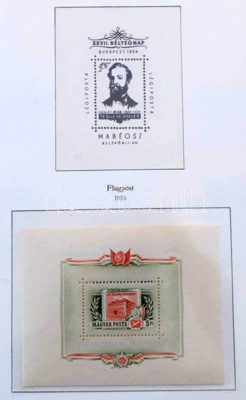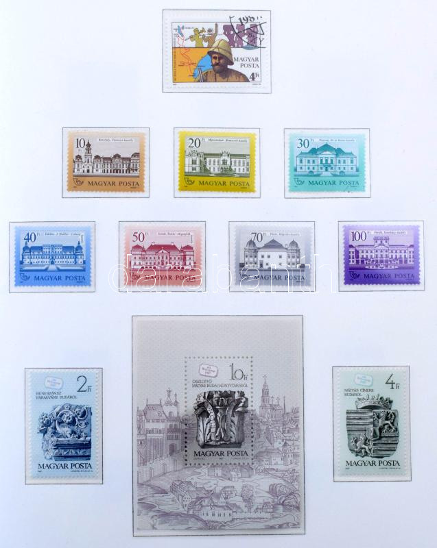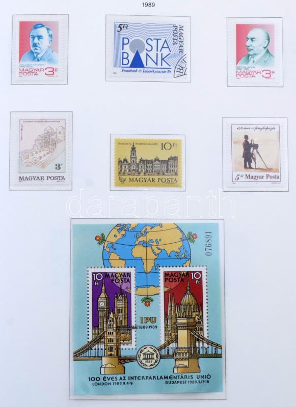 1951-1989 Magyar gyűjtemény sok postatisztával, sorokkal, blokkokkal, kisívekkel, kevés hiánnyal 4 db előnyomott, filázott KABE albumban