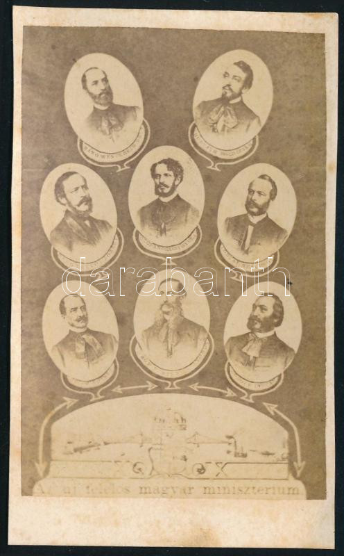 1867 Az Andrássy-kormány (a kiegyezést követő első felelős magyar kormány) tagjai: Wenckheim Béla, Horváth Boldizsár, Eötvös József, Andrássy Gyula, Lónyay Menyhért, Mikó Imre, Festetics György, Gorove István. Keményhátú fotó, 10,5x6,5 cm