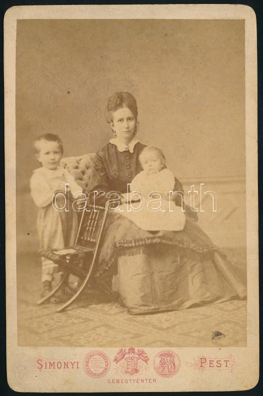 1872 Buda, nő gyermekeivel, keményhátú fotó Simonyi pesti műterméből, hátoldalon feliratozva, 16,5×10,5 cm