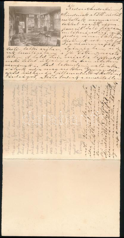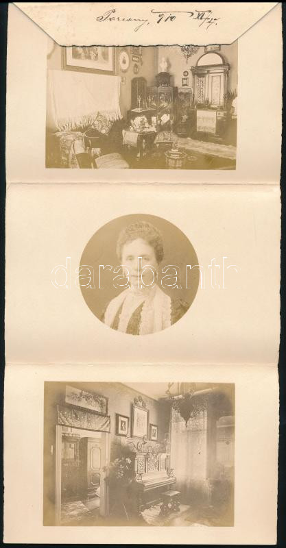1910 Pozsonyi (Felvidék) hely- és fotótörténeti ritkaság, Strelisky Sándor fényképész fióküzletét és műteremlakását (Sétatér 23.) ábrázoló 3 db fotónyomat, valamint elsÅ‘ felesége Béni (Bény) Irma a NépszÃnház művésznÅ‘jének arcképe egy összehajtható kartonon belsÅ‘ (családi) levélként használva, megÃrva, szép állapotban, 10×15 cm