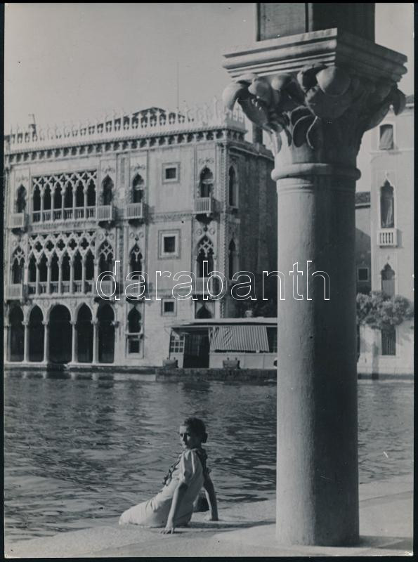 1937 Velence, lány a parton, reprodukciós előhívás, hátoldalon feliratozva, 24×18 cm
