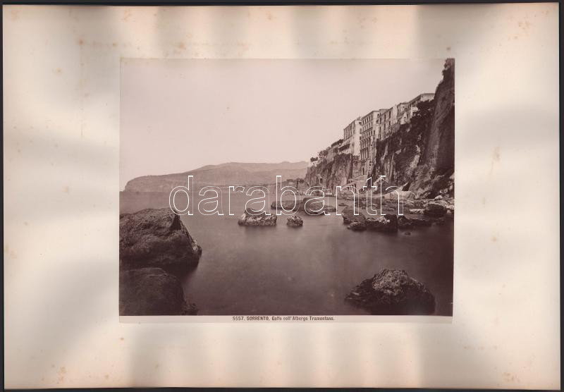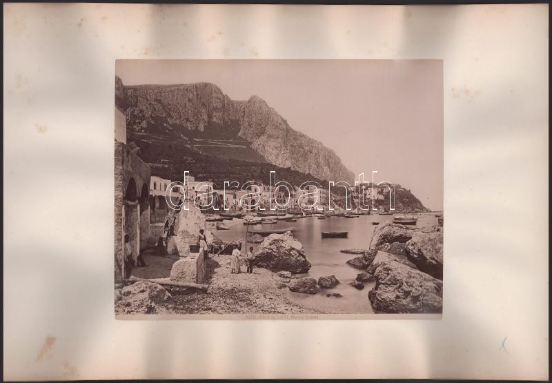 cca 1900 Capri szigete, Marina Grande öböl látképe, a karton másik oldalán: Sorrentó-i öböl, a Tramontina Hotellel (Sorrento Golfo dell'Albergo Tramontano), 2 db nagyméretű fotó kartonon, foltos kartonnal, 20x25 cm, karton: 29x45 cm