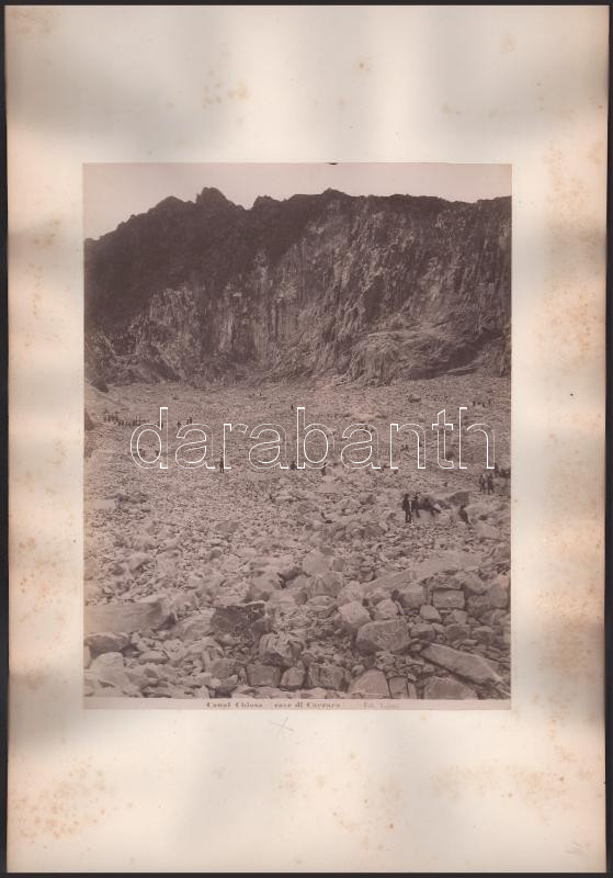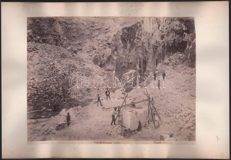 cca 1900 Carrara-i márványbánya környékén készült fotók, feliratozva: Cave di Carrara Lorano / Canal Chiosa Cave di Carrara, 2 db nagyméretű fotó kartonon, Fotografia Valenti, foltos kartonnal, 26x21 cm, 31x23 cm, karton: 29x45 cm