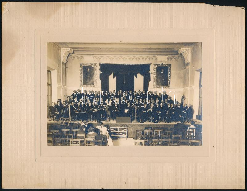 cca 1925 Zenekar és énekkar csoportképe, kartonra kasírozott fotó, karton sérült, 12×16,5 cm