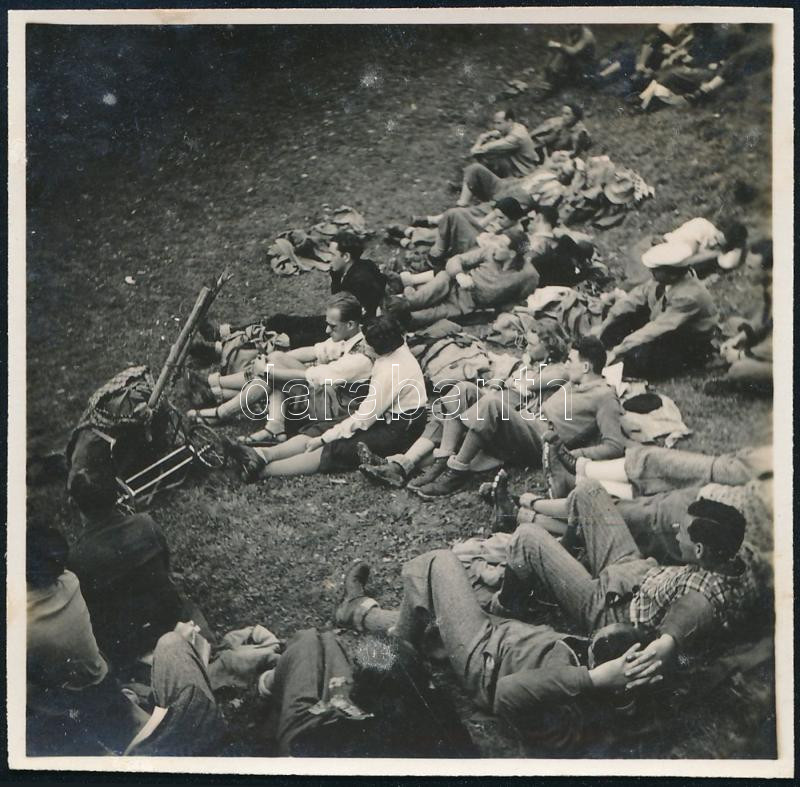 cca 1936 Kinszki Imre (1901-1945) budapesti fotóművész hagyatékából jelzés nélküli vintage fotó (turisták pihenője), 5,6x5,8 cm