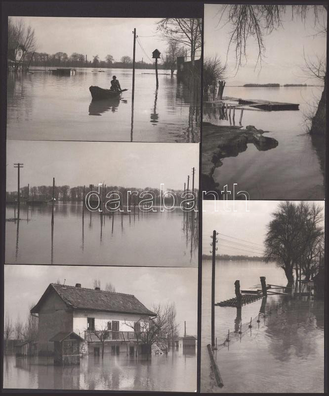 cca 1960-1970 Árvíz a Tisza mentén, 5 db riportkép, 9x15 cm
