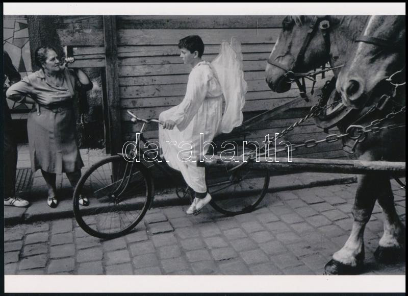 cca 1960 Josef Koudelka (1938) cseh - francia fotóriporter felvétele (Az angyal kerékpáron érkezik), 1 db modern nagyítás, jelzés nélkül, 15x21 cm