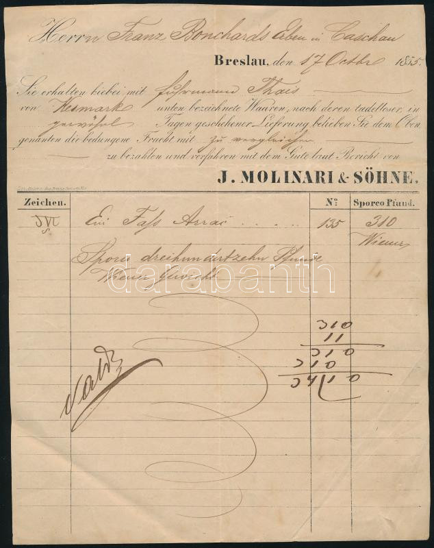 1855 J, Molinari & Söhne. Breslau. számla