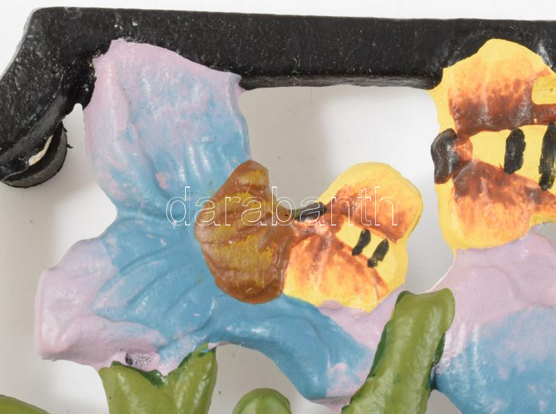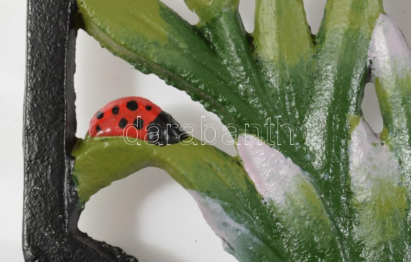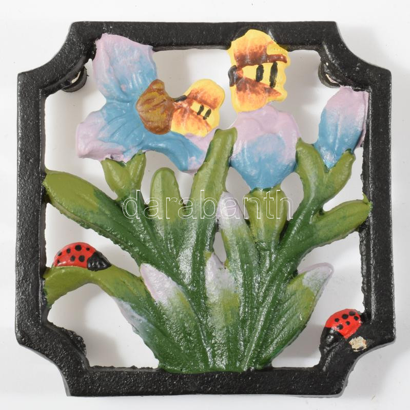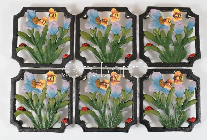 6 darab szecessziós stílusú öntöttvas edényalátét, virág- és bogármintákkal festett, 10,5x10,5 cm, nagyobb alátétté is összerendezhetőek, hibátlan.