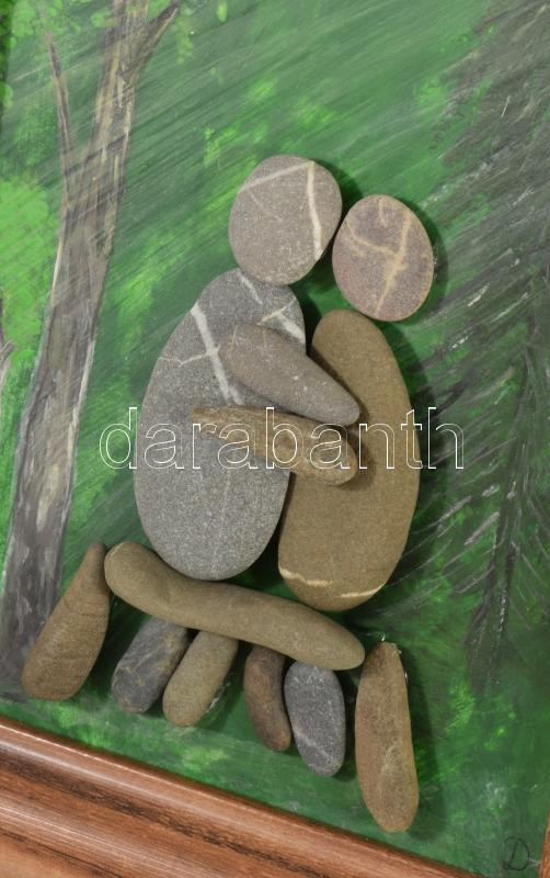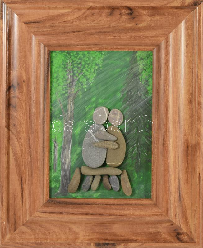 Jelzés nélkül: Erdei ölelés. Olaj, karton, kő, dekoratív keretben. Külső méret 24x30 cm
