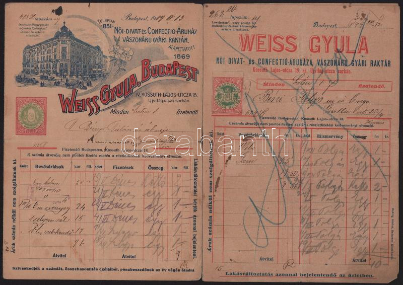 1899-1907 Bp., Weiss Gyula női-divat és confectio-áruház, vászonáru gyári raktár 2 db díjjegyes számla