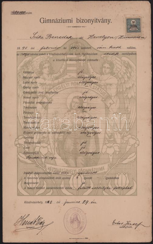 1910 Kézdivásárhely, gimnáziumi bizonyítvány 30f okmánybélyeggel, kisebb lapszéli sérülésekkel