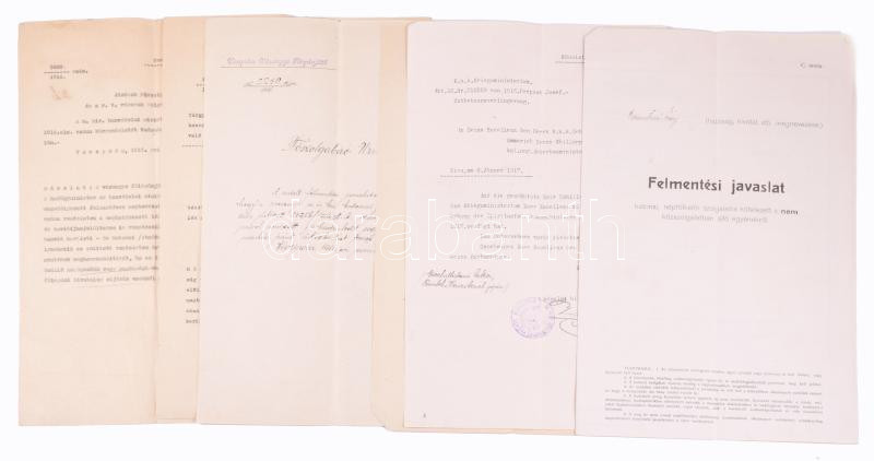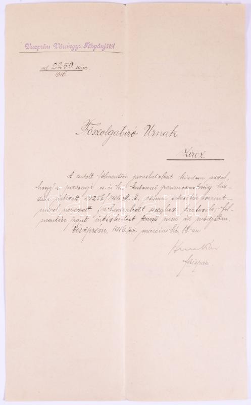 1916-1917 Hunkár Béla, Veszprém vármegye főispánja aláírásával ellátott hivatalos iratok, 6 db, közte Felmentési javaslat népfelkelésre kötelezett s nem közszolgálatban álló egyénekről, a Cs. és Kir. Hadügyminisztérium által kiállított irat másolata, stb.