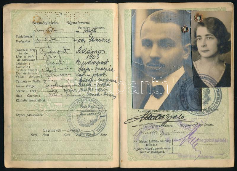 1931 Bp., Magyar Királyság által kiállított fényképes útlevél férj és feleség részére (mindkettőjük fotójával), román vízumokkal