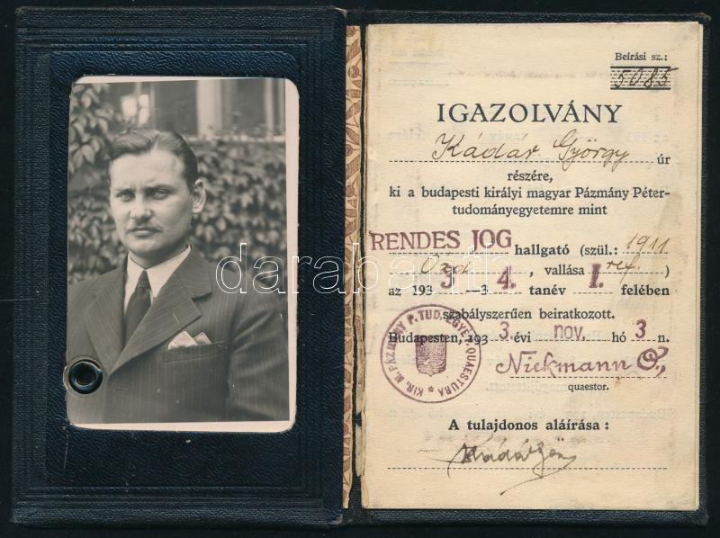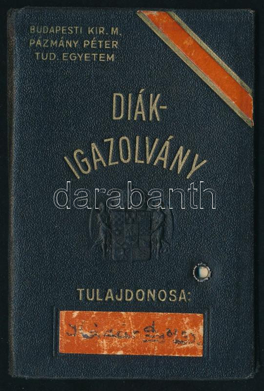 1933 Budapesti Kir. M. Pázmány Péter Tudományegyetem fényképes diákigazolványa joghallgató részére