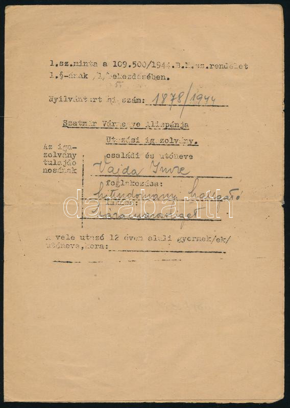1944 Szatmárnémeti, Szatmár vármegye alispánja által kiállított utazási igazolvány