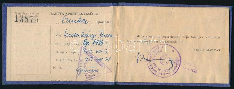 1955 Bástya SE tagsági könyv, bélyegekkel