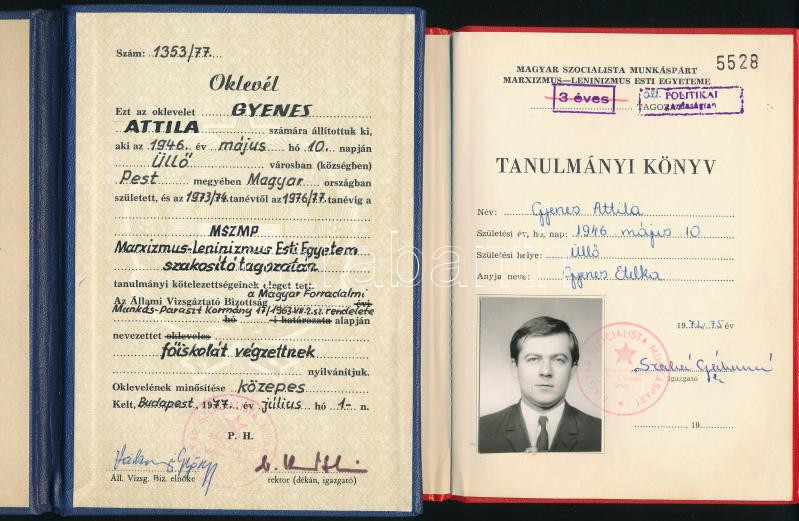 1973-1977 MSZMP Marxizmus-Leninizmus Esti Egyeteme leckekönyv és oklevél