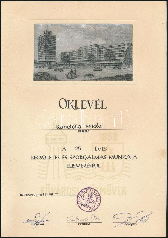 1988 Bp., a Fővárosi Vízművek oklevele Szmetella Miklós vízmérnök részére, aláírásokkal, 30x21 cm