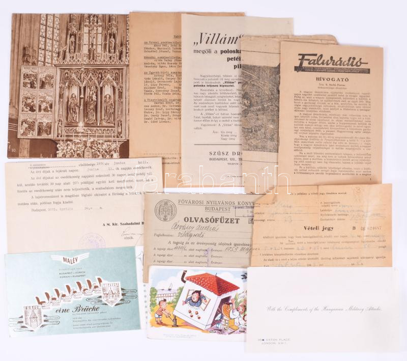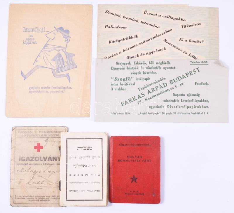 Vegyes papírrégiség tétel, pl. végzés, izraelita gyermek imafüzet, MKP tagsági könyv, stb.